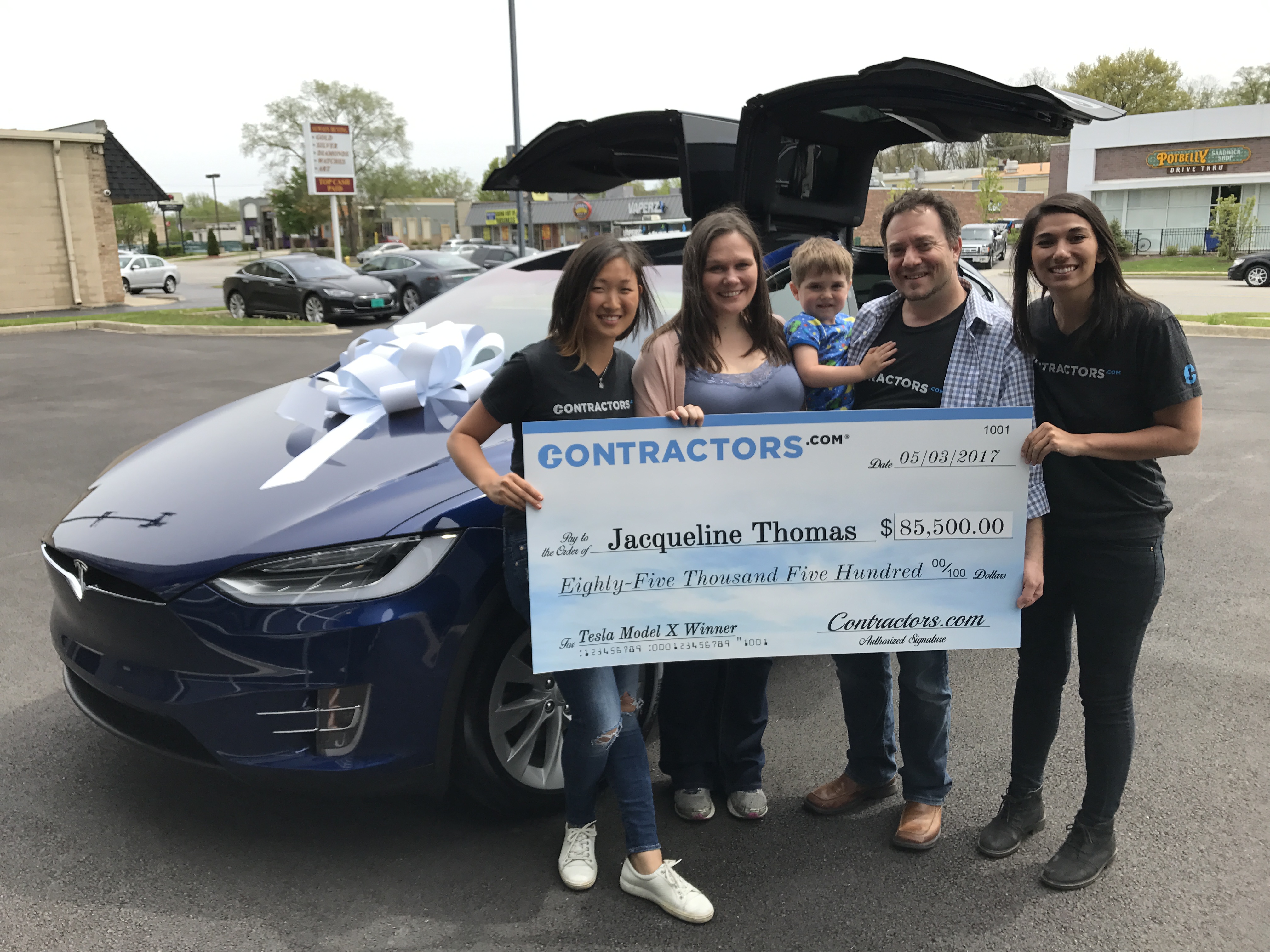 SAN RAMON, CALIFORNIA , UNITED STATES, May 4, 2017 /EINPresswire.com/ -- San Ramon, CA — A lucky resident of Springfield, Illinois drove home Wednesday in a brand new, customized Tesla Model X awarded to her from Contractors.com. Jacqueline Thomas won the $85,500 valued prize in an online sweepstakes that was held by Contractors.com in the months leading up to the beta launch of its cutting edge platform – a home improvement service with ambitions of revolutionizing the way property owners find and book quality contractors.Founded by Silicon Valley veteran, Payam Zamani, Contractors.com aims to transform an industry typically characterized by extreme customer dissatisfaction. The company strives to bring about a service based on love and care to a relationship that touches one of the most personal assets of any family, their home. The service is available on the web at www.contractors.com and for download on the App Store and Google Play.