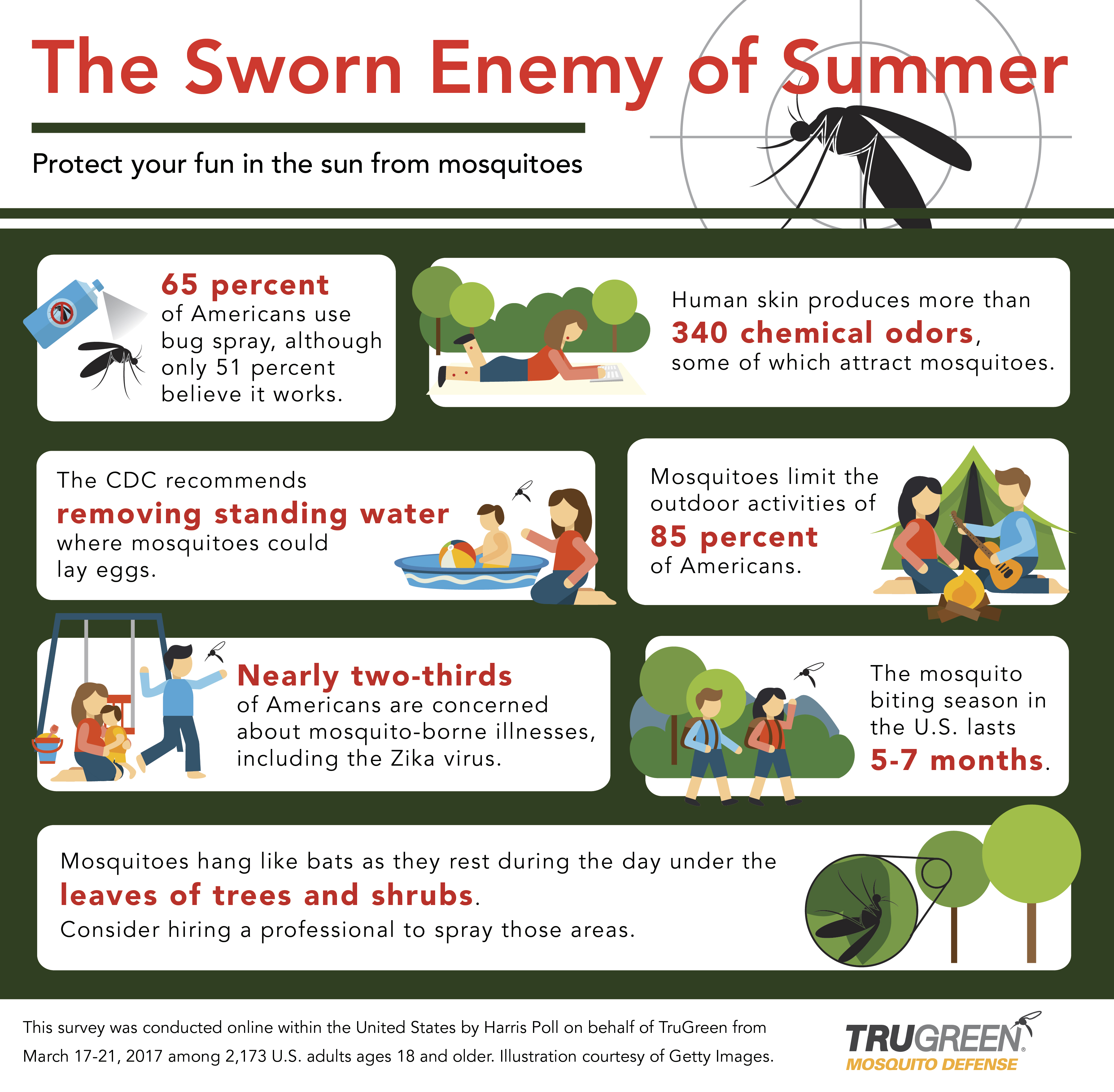 According to a Harris Poll conducted on behalf of TruGreen, 85 percent of Americans say that mosquitoes limit their family's outdoor activities during the months they're most active. The same survey also found that nearly two-thirds of Americans are concerned about protecting themselves and their family from Zika or other mosquito-borne illnesses.