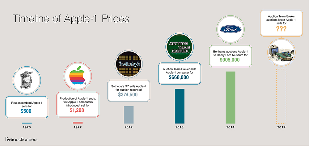 That price surpassed the $640,000 record for an Apple-1 set in November 2012, also at Auction Team Breker. The transaction represented a dramatic increase in value over the previous Apple-1 auction record of $374,500, which was set in June 2012 at Sotheby’s in New York.