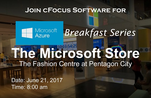 In collaboration with The Microsoft Store Fashion Centre at Pentagon City, cFocus Software launched the Microsoft Azure Breakfast Series in May 2017 to provide an opportunity for networking and training over breakfast to individuals interested in Microsoft Azure.