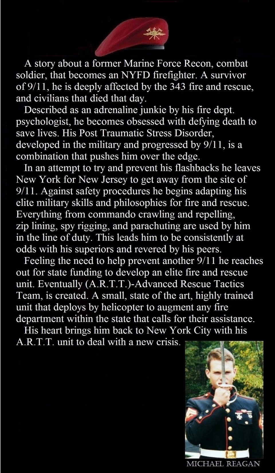 A story about a former Marine Force Recon, combat that becomes an NYFD firefighter. A survivor of 9/11, he was deeply affected by the 343 fire and rescue, and civilians who died that day.