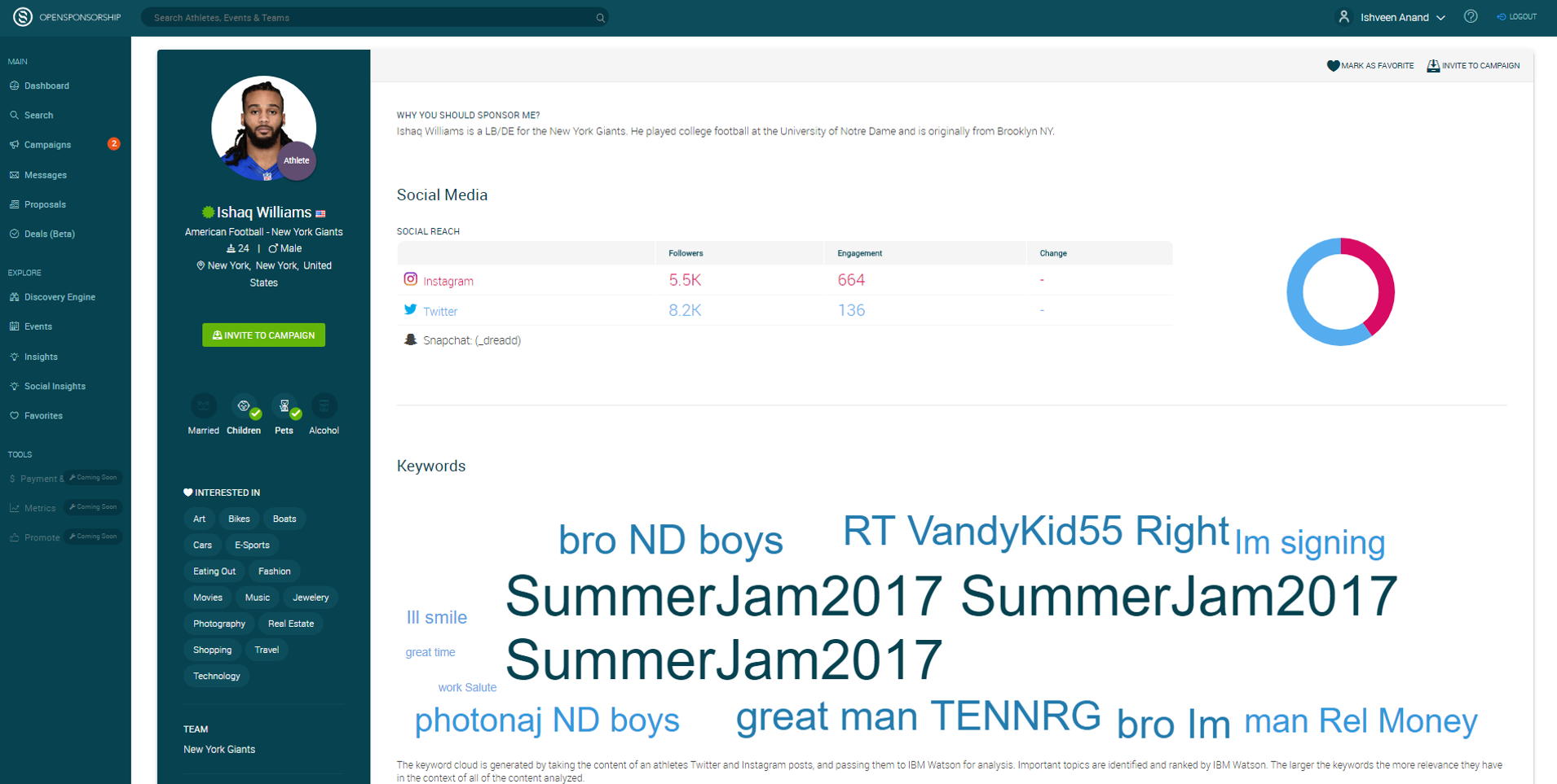 OpenSponsorship is a sports technology marketplace connecting brands to athletes, teams and sports events for sponsorship opportunities. The company backed by notable VCs in New York, San Francisco and Hong Kong and is headquartered in New York. The company mission is to make sports sponsorship more accessible, transparent and accountable. The company was named a finalist in the Sports Technology Awards, and the founder and CEO Ishveen Anand was included in the Forbes 30 under 30 sports list.