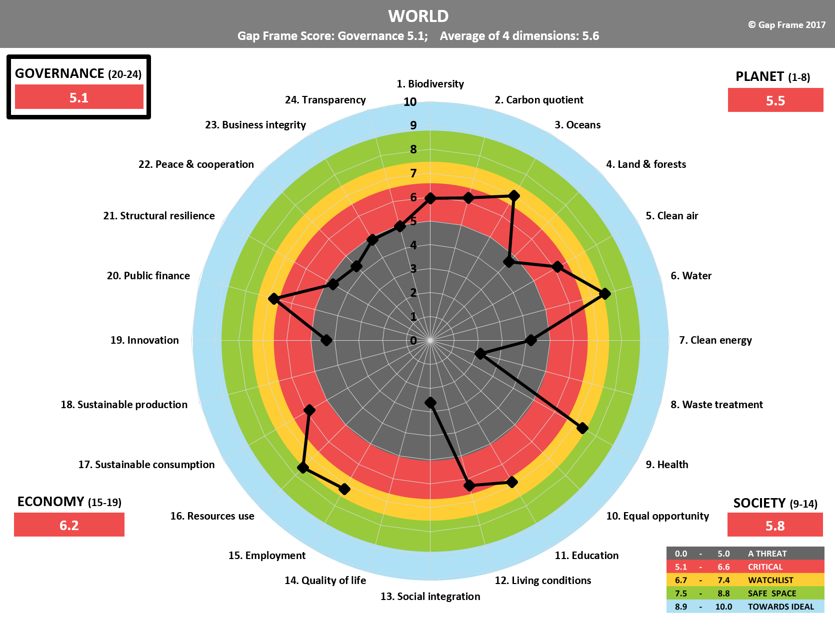 'With a GAPFRAME Score of 5.1 the world is in a critical state with all four of its dimensions measuring less than 6.3. No surprise! Major threats in issues of peace & cooperation, structural resilience, business integrity, and transparency result in Governance being identified as the priority dimension. However burning issues such as waste treatment, social integration, clean energy, innovation, and land & forest, represent equal threats in the dimensions of Planet, Economy, and Society. On a slightly more positive note: biodiversity, sustainable consumption, carbon quotient, clean air, and living conditions are at a critical stage.'