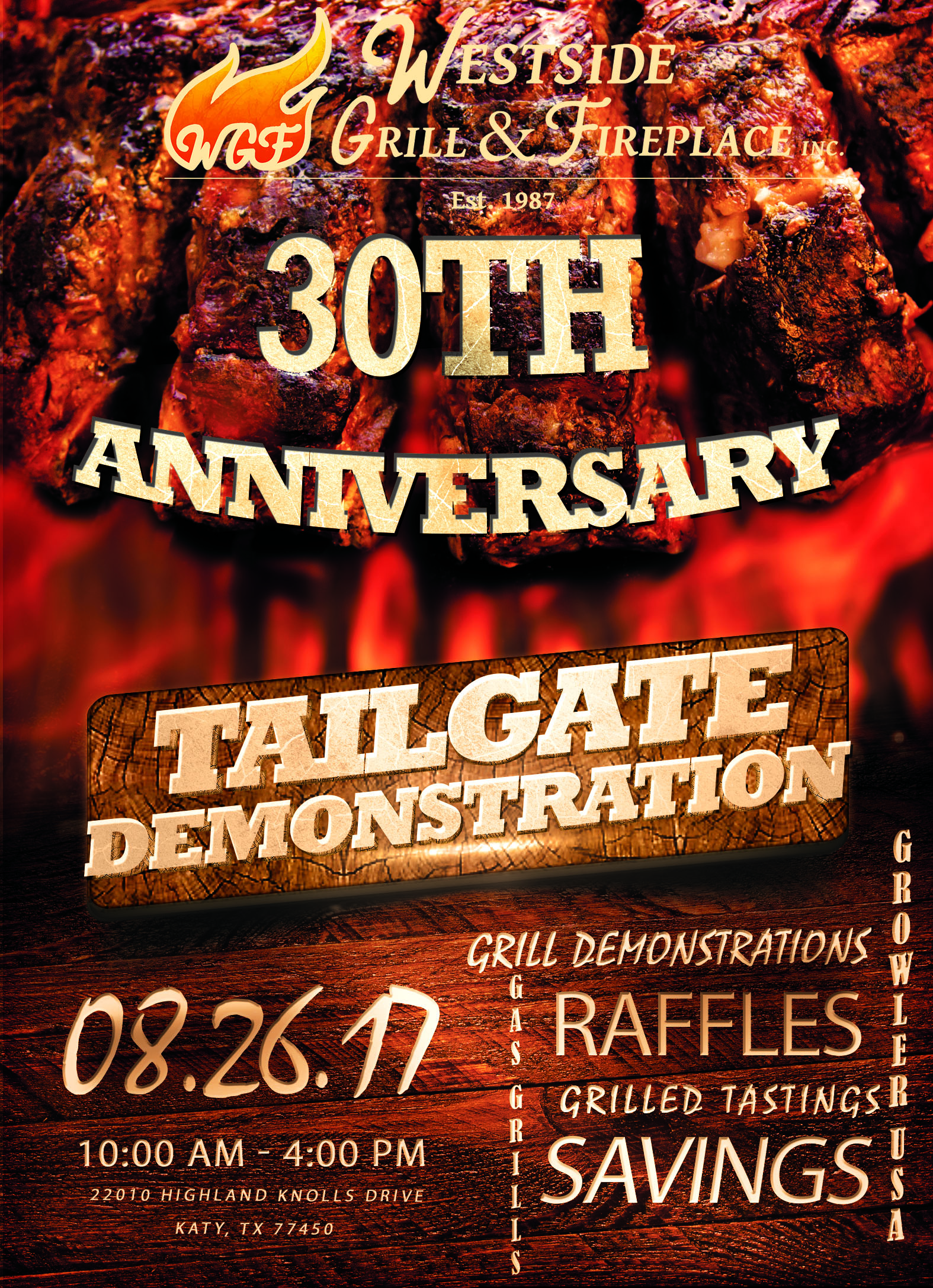 HOUSTON, TX, UNITED STATES, August 18, 2017 /EINPresswire.com/ -- Westside Grill & Fireplace will celebrate 30 years of business with a Tailgate Grilling Demonstration party, complete with great deals on grills, live demonstrations from grill experts, raffle prizes, delicious eats from various vendors and music, Sat., Aug. 26, 2017.