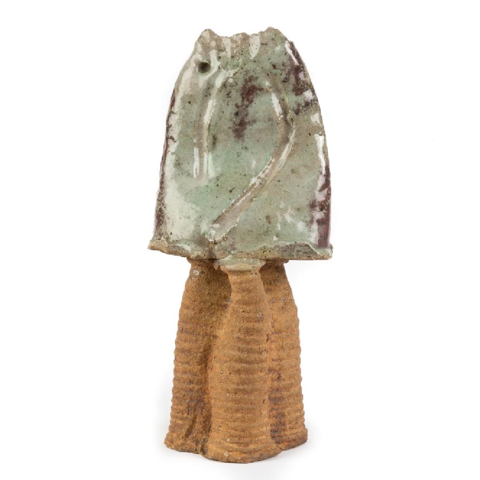 A stoneware spear sculpture with copper flashing by John Mason (Am., b. 1927), circa 1963, artist signed and 20 inches in height, changed hands for $50,740. Tops in the vintage furniture category was a stack laminated mahogany cloud form desk in steel gray, signed “WC 1979” by Wendell Castle (Am., b. 1932), on an aluminum base with a black mirrored glass top ($28,320).