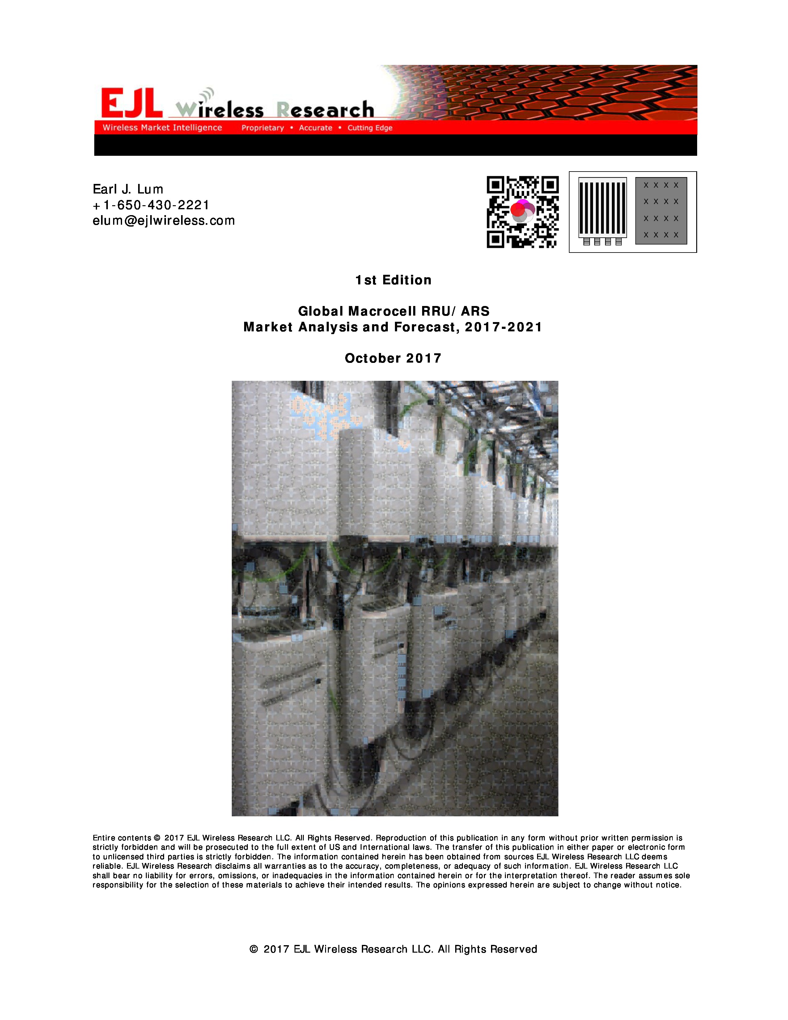 SALEM, NH, UNITED STATES, October 9, 2017 /EINPresswire.com/ -- Shipments of remote radio units (RRU) and antenna radio systems (ARS) dropped by 8% in 2016, according to the latest report from EJL Wireless Research titled “Global Macrocell RRU/ARS Market Analysis and Forecast, 2017-2021 1st Edition.” “We are excited to finally introduce the third product in our series of research reports focused on the macro cell market. The RRU/ARS report complements our existing radio transceiver (TRx), digital baseband unit (BBU), and base station antenna research,” says founder and President, Earl Lum. EJL Wireless Research is forecasting that the macrocell RRU/ARS market will see a 14% decline in shipments in 2017 due to lower CAPEX spending in China and Asia Pacific as well as softness in other regions.
