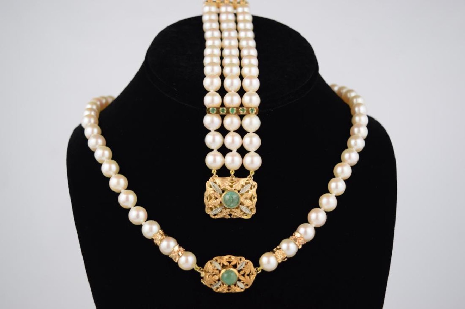 The expected top lot from the Alexander items is the 18kt gold emerald Mikimoto pearl necklace and bracelet (est. $5,000-$7,000). It was a gift from her husband, Dr. Ladislav Alexander, who purchased a rope-length single strand of Mikimoto pearls from a Japanese wholesaler. He pulled the best pearl from the strand and then Edith later had it made into the necklace and bracelet set.