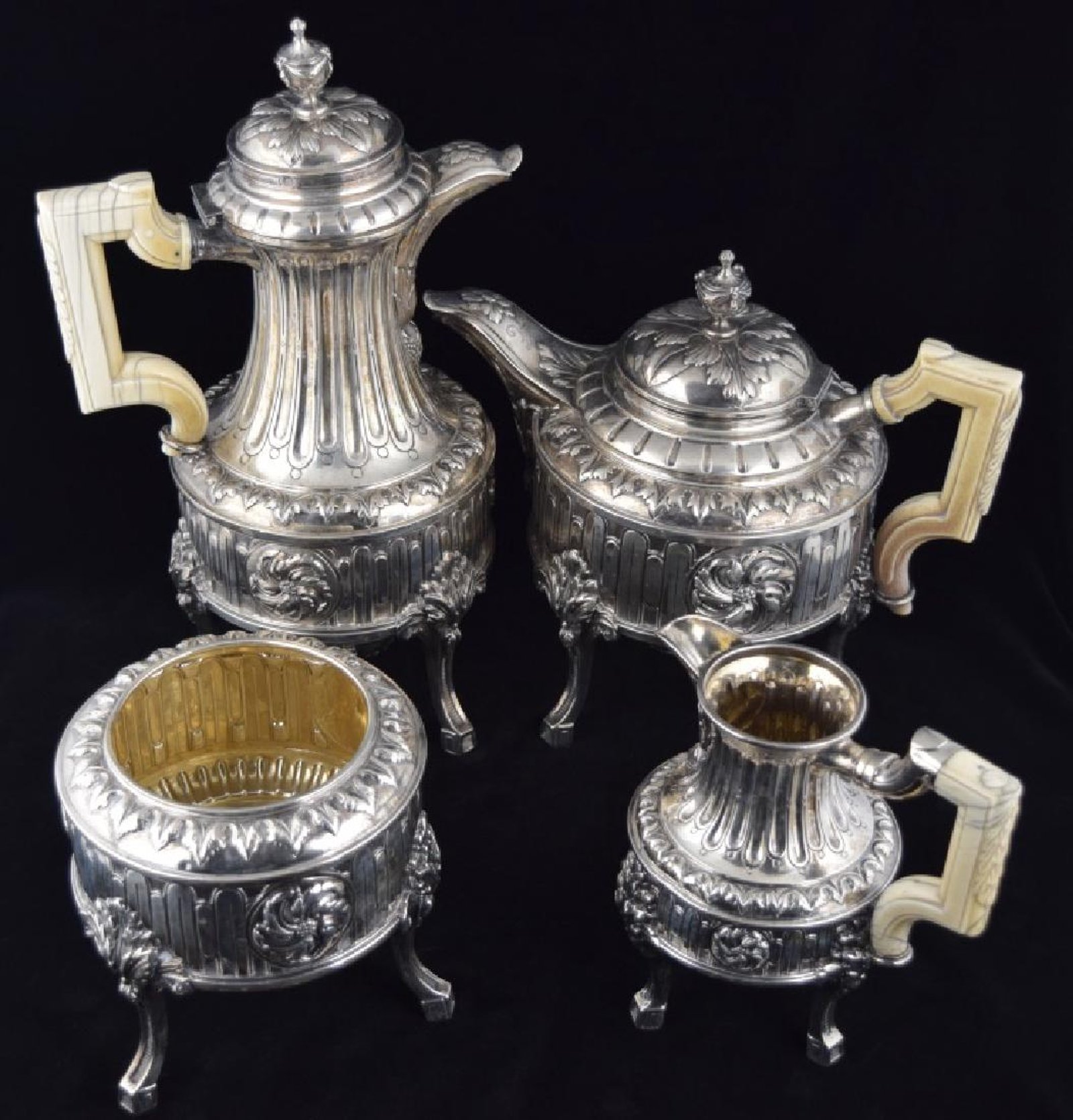 The Frederick Elkington heavy gauge, sterling silver service, made in 1881, includes a coffee pot, teapot, large sugar and large creamer, with a total weight of around 150 ozt. (est. $2,000-$6,000). The Stephen Smith sterling silver teapot, hallmarked in London in 1871, is in the Cellini style, named after the 16th century Florentine silversmith Benvenuto Cellini (est. $1,000-$3,000).