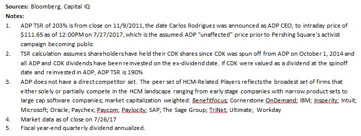 1 ADP TSR of 203% is from close on 11/9/2011, the date Carlos Rodriguez was announced as ADP CEO, to intraday price of $111.65 as of 12:00PM on 7/27/2017, which is the assumed ADP "unaffected" price prior to Pershing Square's activist campaign becoming public; this TSR calculation assumes shareholders have held their CDK shares since CDK was spun off from ADP on October 1, 2014 and all ADP and CDK dividends have been reinvested on the ex-dividend date. If CDK were valued as a dividend at the spinoff date and reinvested in ADP, ADP TSR is 190%.