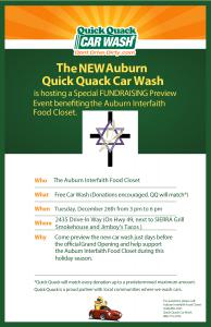 In conjunction with the Grand Opening, Quick Quack will hold a special “Preview” Fundraiser on Tuesday, December 26th from 3 p.m. to 6 p.m. to benefit the Auburn Interfaith Food Closet in their efforts to assist hungry and disadvantaged families in the area. Cars will be washed for free during the fundraiser and Quick Quack will be matching donations from customers.