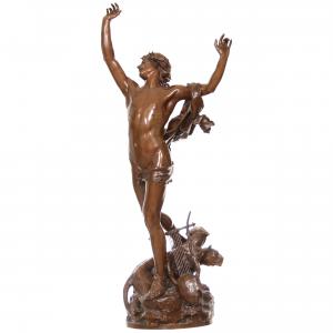 Bronzes will showcase an original statue, 39 inches tall by 16 inches wide, titled Cerberus, artist signed “Raoul Verlet” (Fr., 1857-1923), from the Ferdinand Barbeditenne foundry in Paris, with great detail and patina; and a 24-inch-tall statue, signed by Edmond Louis Charles Tassel (Fr., 1870-1900), of a young maiden carefully crossing a stream, on a marble base, titled Passage du Ruisseau, dated 1890.