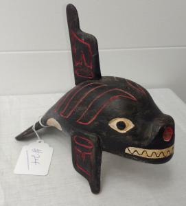 A nicely carved cedarwood and paint whale figure, crafted around the 1920s in Haida (in northwestern Canada), 10 inches tall by 8 inches wide, in good condition, should command $500-$1,000. Also, a prehistoric knob-top pestle, made of basalt and found along the Columbia River, 10 inches tall and in good condition, is a nice showpiece and should garner $300-$600.