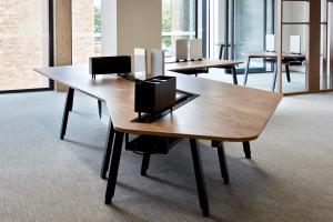 The project required a series of geometrical top shapes, which would join to create long benches throughout the office. Aspect used the contemporary Runway desk base system, with a dual tool rail fitted to the back edge of the desktop.