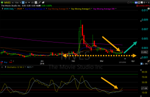As you can see by the chart, historically, when MVES crosses its Exp. moving average, the stock has experienced dramatic upticks. On February 6th, when we saw the stock rise from .0015 to .0089, or 493% over two trading days before settling in the mid .002’s, and then again on February 21st, 60%. If it breaks through its average again, we can experience a similar climb. Furthermore, Stochastics just turned positive, and MVES continues to trade above its support.