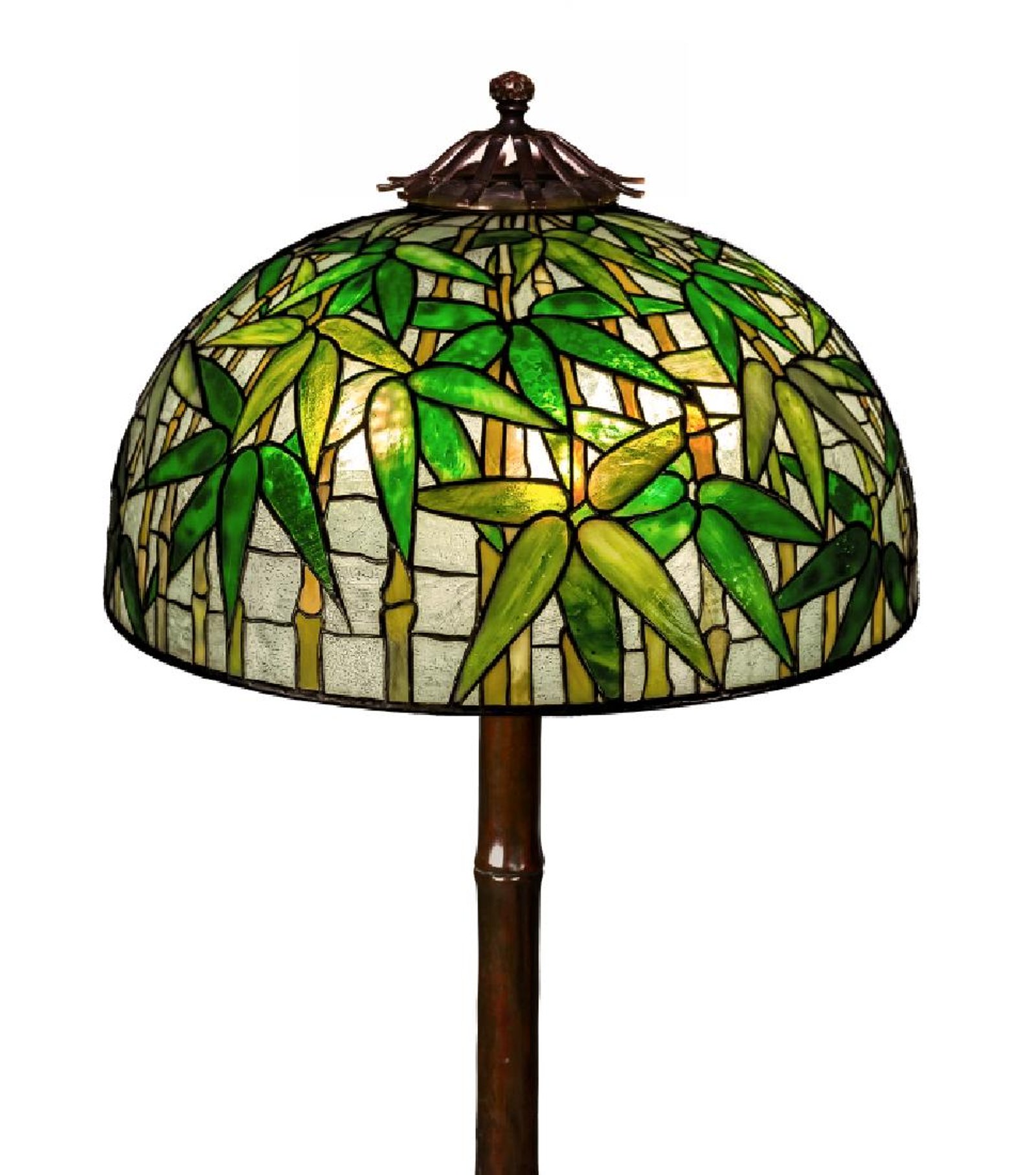 The 'Bamboo' leaded glass and bronze floor lamp on a 'Bamboo' senior base, made circa 1910, featured a shade signed “Tiffany Studios New York”. The ‘Bamboo’ lampshade is one of a handful of models produced by Tiffany Studios that incorporated curved panels of glass, a labor-intensive, time-consuming process in which individual pieces were cut.