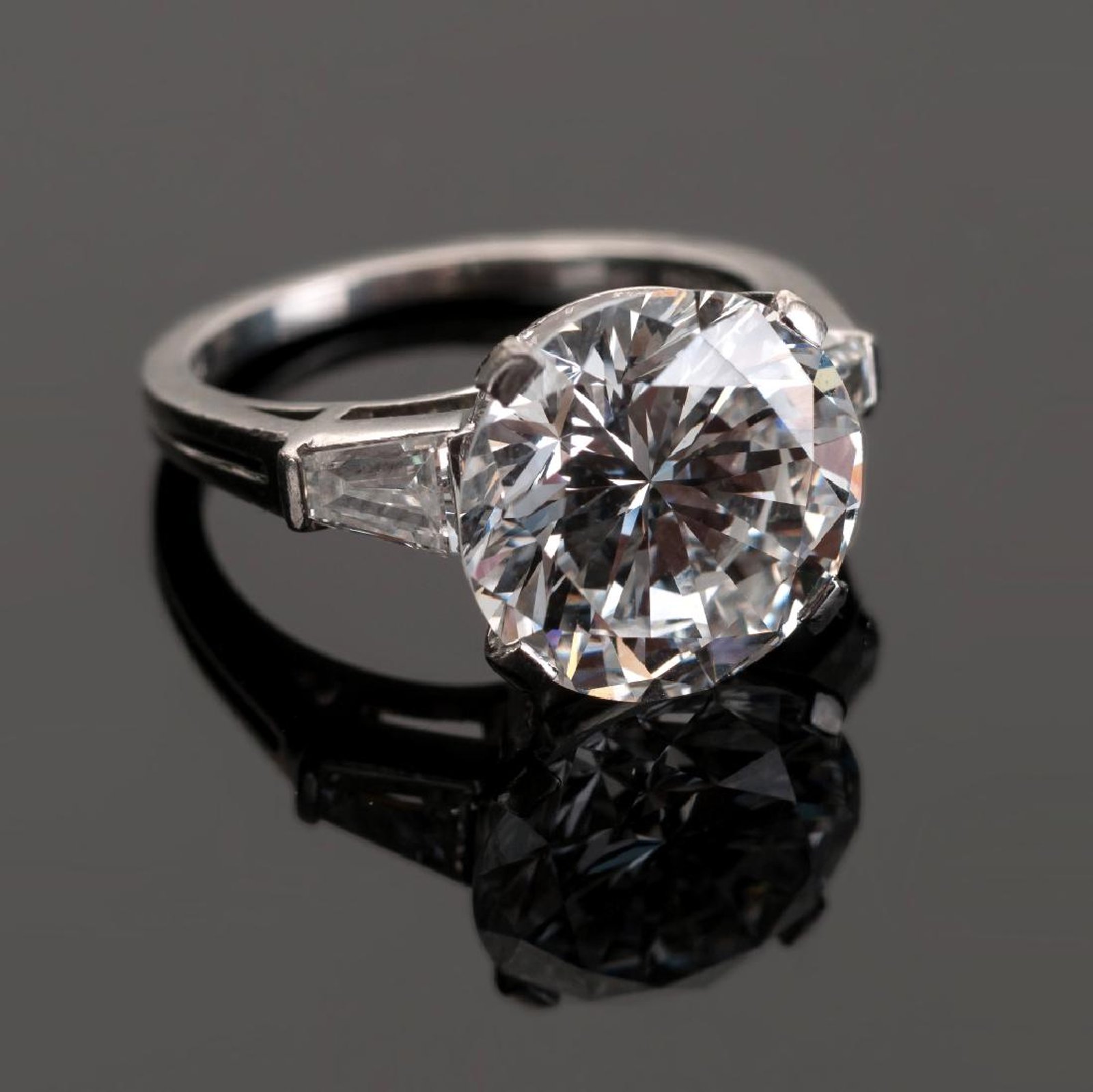 The vintage Tiffany & Company 5.25-carat diamond ring, from an estate in Rochester, N.Y., was set in platinum and came with a flattering GIA report. The round brilliant diamond boasted color E and clarity VS1, and had good cut. Both sides were bar set with tapered baguettes, having an estimated weight of .45 carats and VVS clarity, E-F color.