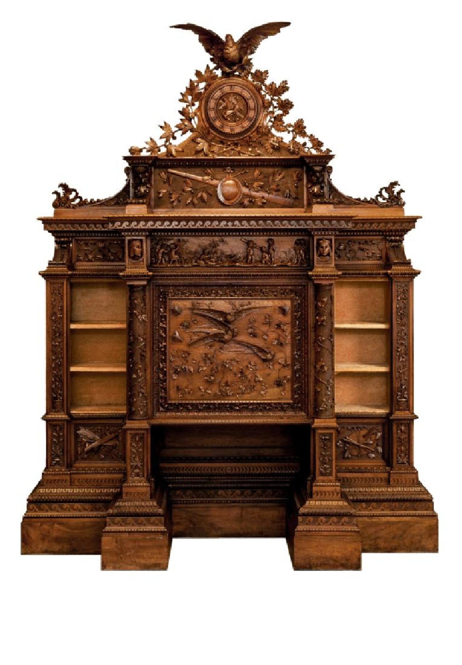An Italian Renaissance-style walnut secretary, made in Florence around 1870 by Luigi Frullini (It., 1839-1897), covered with beautifully carved panels and borders of flowers, leaves and conventional figures, hit $54,280. Four doves in flight were depicted on the main panel of the 8 foot 4 inch tall secretary, while a dove with outstretched wings surmounted a dial face above.