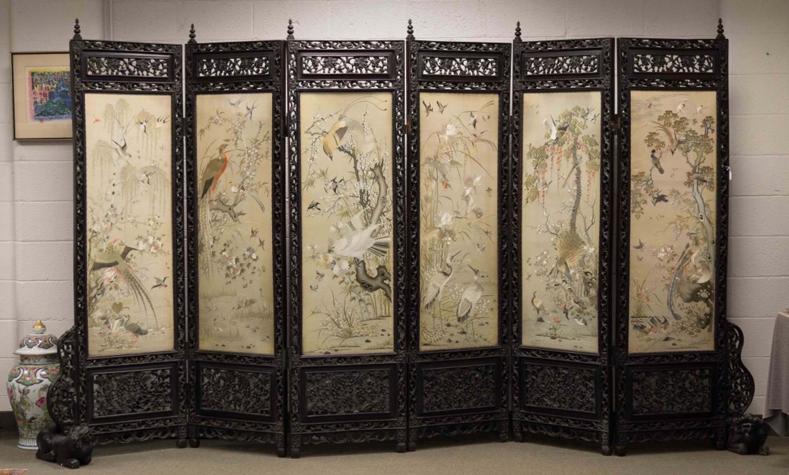 A late 19th century Chinese carved hardwood and silk six-panel screen with a carved foo dog base and featuring exotic birds and foliage, overall 6 feet 11 inches tall by 12 feet 6 inches wide (with each panel 23 inches wide) realized $42,480. Also, a 19th century Native American Zia pot with three colors and moths, 19 inches tall, brought $9,440 despite a chip and a hairline crack.