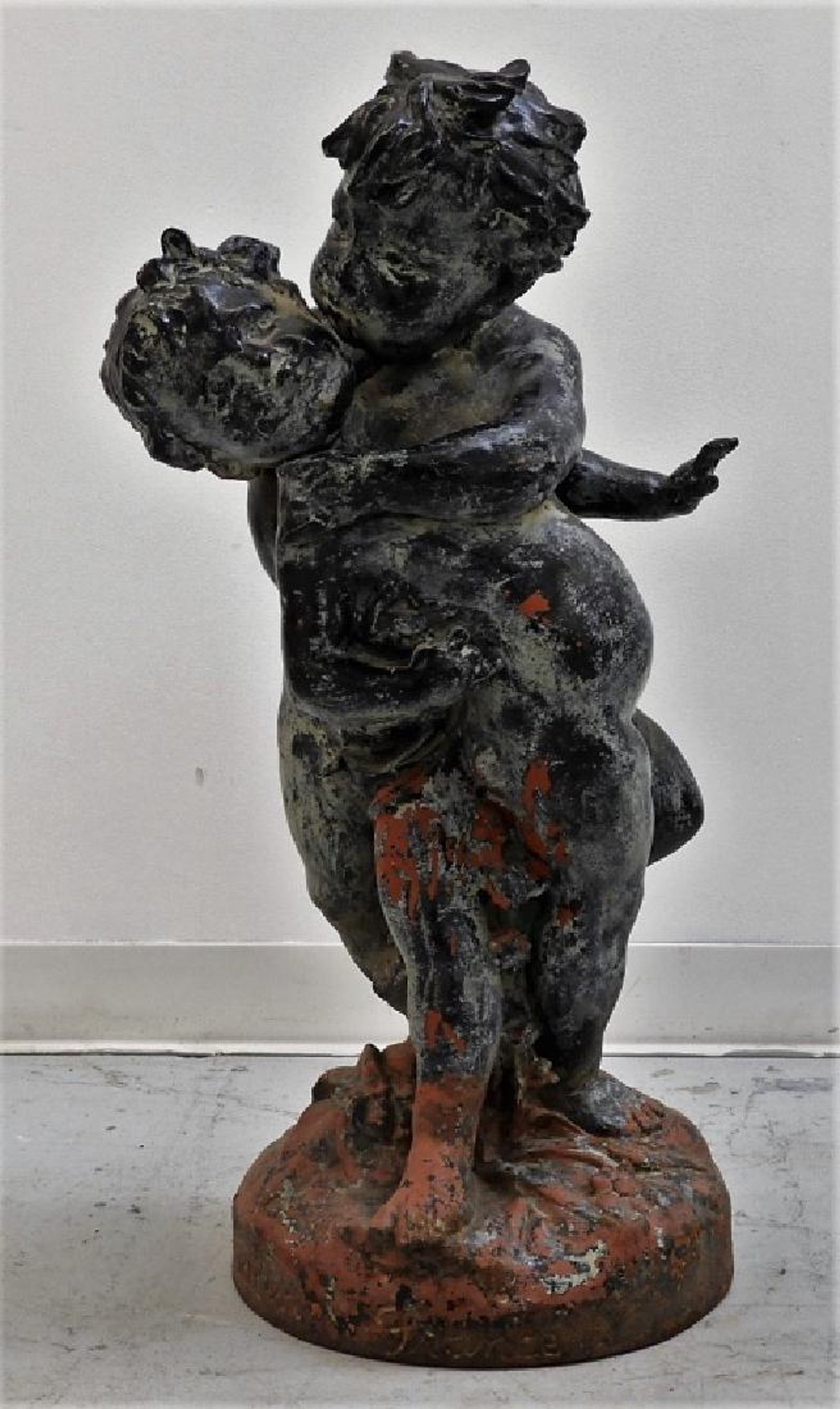A bronze and marble 19th century French neoclassical figural group, large, with an overall height of 36 inches, depicts a courting couple standing near a plant stand, on an ormolu bronze mounted rouge marble base. The group is signed “Dumege” and is stamped “Made in France”. The item’s only imperfections are two small cracks on either side of the marble base (est. $2,000-$3,000).