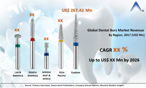 NEW YORK CITY, NEW YORK, UNITED STATES, April 24, 2018 /EINPresswire.com/ -- Absolute Markets Insights offers its latest published report ‘Dental Burs Market by Shank Type (Long Straight Shank, Latch – Type Shank, Friction Grip Shank); by Material (Stainless Steel, Tungsten Carbide, Others); by Shape (Round, Straight, Inverted Cone, Tapered Fissure, Pear Shaped); by Application (Surgical, Orthodontic, Laboratory, Others); by Regional Outlook (U.S., Rest of North America, France, UK, Germany, Spain, Italy, Rest of Europe, China, Japan, India, Southeast Asia, Rest of Asia Pacific, GCC Countries, Southern Africa, Rest of MEA, Brazil, Rest of Latin America) – Global Insights, Growth, Size, Comparative Analysis, Trends and Forecast, 2018 - 2026.’ The author of the report analyzed that the Global Dental Burs Market accounted for US$ 828.20 Mn in 2017.Purchase the complete report titled “Dental Burs Market - Global Insights, Growth, Size, Comparative Analysis, Trends and Forecast, 2018-2026” at https://www.absolutemarketsinsights.com/checkout?id=5