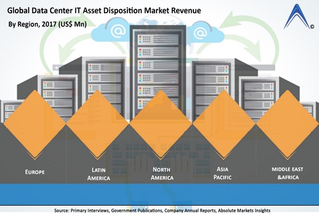 NEW YORK CITY, NEW YORK, UNITED STATES, April 24, 2018 /EINPresswire.com/ -- Absolute Markets Insights offers latest published report, ‘Data Center IT Asset Disposition Market by Service (De-Manufacturing and Recycling, Remarketing and Value Recovery, Data Destruction/Data Sanitization, Logistics Management and Reverse Logistics, Other Services {On-Site Equipment Audit Solution, Online Clients’ Portal}); by Asset Type (Computer/Laptops, Servers, Mobile Devices, Storage Devices, Peripherals {Networking Devices, I/O Devices}); by Organization Size (SOHO and Medium Enterprises, Large Enterprises); by End-Use (Banking, Financial Service, and Insurance (BFSI), IT and Telecom, Educational Institutions, Healthcare Industry, Aerospace and Defense, Public Sector and Government offices, Manufacturing, Media and Entertainment, Others {Energy and Utility, Construction and Real Estate, Logistics and Transportation}); by Regional Outlook (U.S., Rest of North America, France, UK, Germany, Spain, Italy, Rest of Europe, China, Japan, India, Southeast Asia, Rest of Asia Pacific, GCC Countries, Southern Africa, Rest of MEA, Brazil, Rest of Latin America) – Global Insights, Growth, Size, Comparative Analysis, Trends and Forecast, 2018 - 2026’. The author of the report analyzed that the global data center IT asset disposition market accounted for US$ 12,249.22 million in 2017. IT asset disposition (ITAD) is the business built around setting of outdated or unwanted equipment in a safe and ecologically-responsible way. Organizations with old equipment, face confusion with the decisions of whether to renovate, resell, recycle or dispose the business equipment. If IT asset disposition is avoided for too long, it becomes a huge problem, as it takes up space, increases company’s risk.Purchase the complete report titled “Data Center IT Asset Disposition Market - Global Insights, Growth, Size, Comparative Analysis, Trends and Forecast, 2018-2026” @ https://www.absolutemarketsinsights.com/checkout?id=4