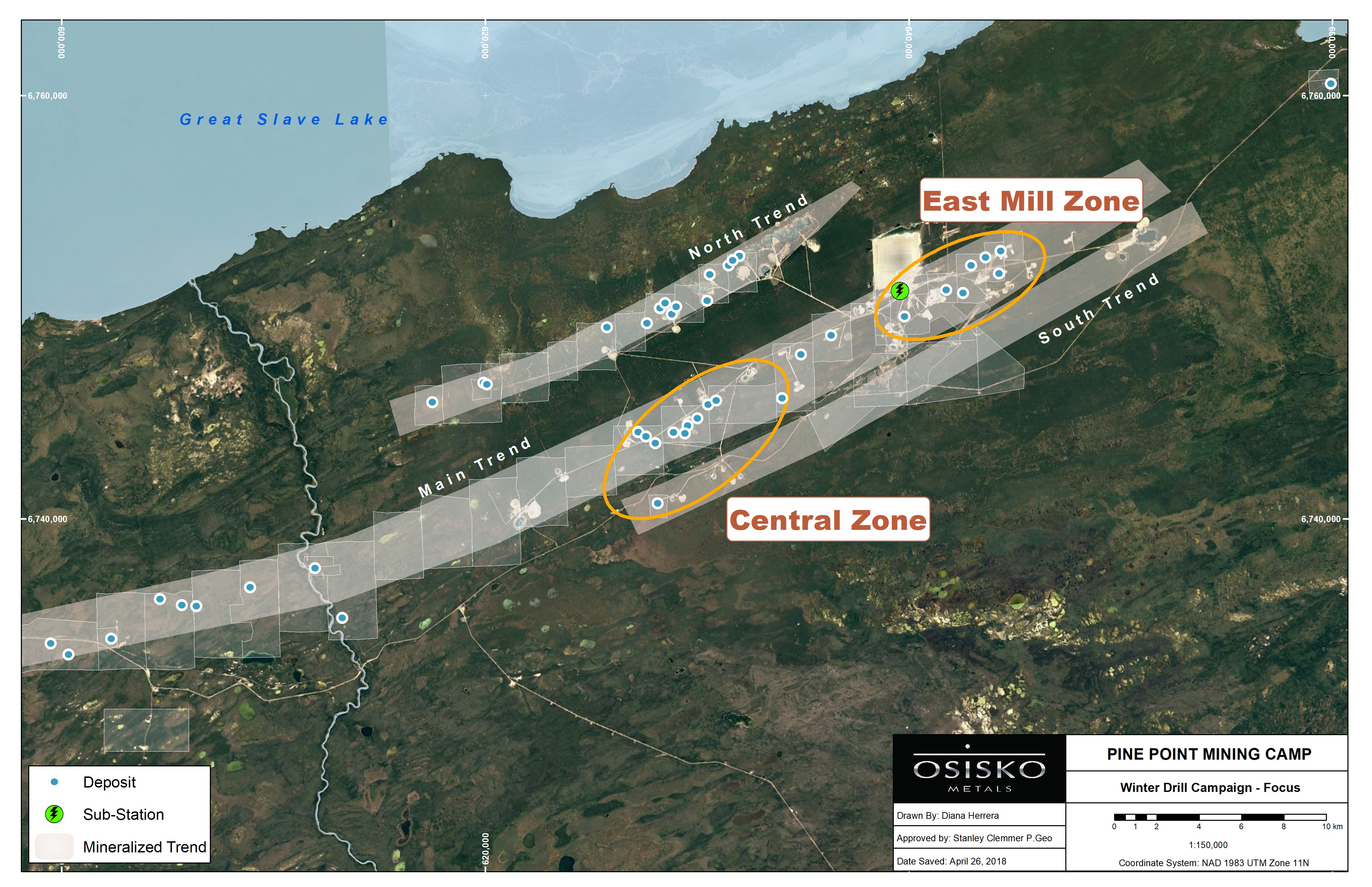 Winter drilling was completed in the East Mill Zone (formerly known as the Cluster 1) and the Central Zone (formerly known as the Cluster 2 area). The East Mill Zone is a 7.6-kilometre trend of tabular-style mineralization that extends to the east from the electrical substation where the former Cominco concentrator was located. The Central Zone is comprised of a 5.0-kilometre trend of historical deposits, located 10 kilometres to the west of the substation. The mineralized trend comprising these zones is called the “Main Trend” and it extends further to the east and west. It runs parallel to the “North Trend” and the “South Trend” that contain similar mineralization and deposits. These three trends host both tabular and prismatic type mineralization (see below). In all areas, the historical resources were drilled and recorded between 1964-87 by Cominco Ltd. (See Pine Point Mining Camp Map)