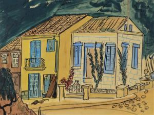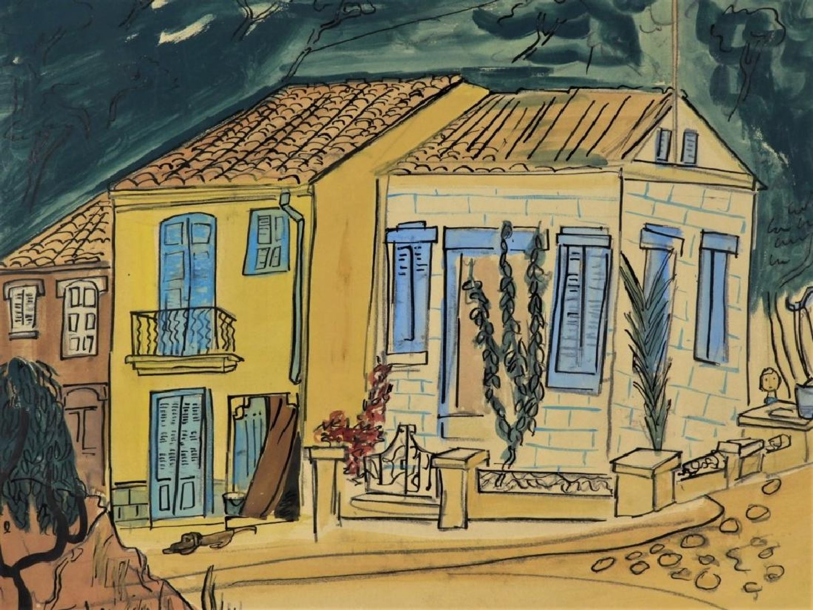 The casein paint, ink and pencil on board by Bemelmans measured 26 inches by 30 inches in the frame and depicted a quaint strip of homes in Palma, the capital of the Balaeric Islands of Spain. It was signed and dated 1956. Bemelmans was truly an international artist. He was born in what was then Austria-Hungary (now Italy) to a Belgian father and German mother. His first language was French (his second was German). He emigrated to the U.S. and became a citizen in 1918.