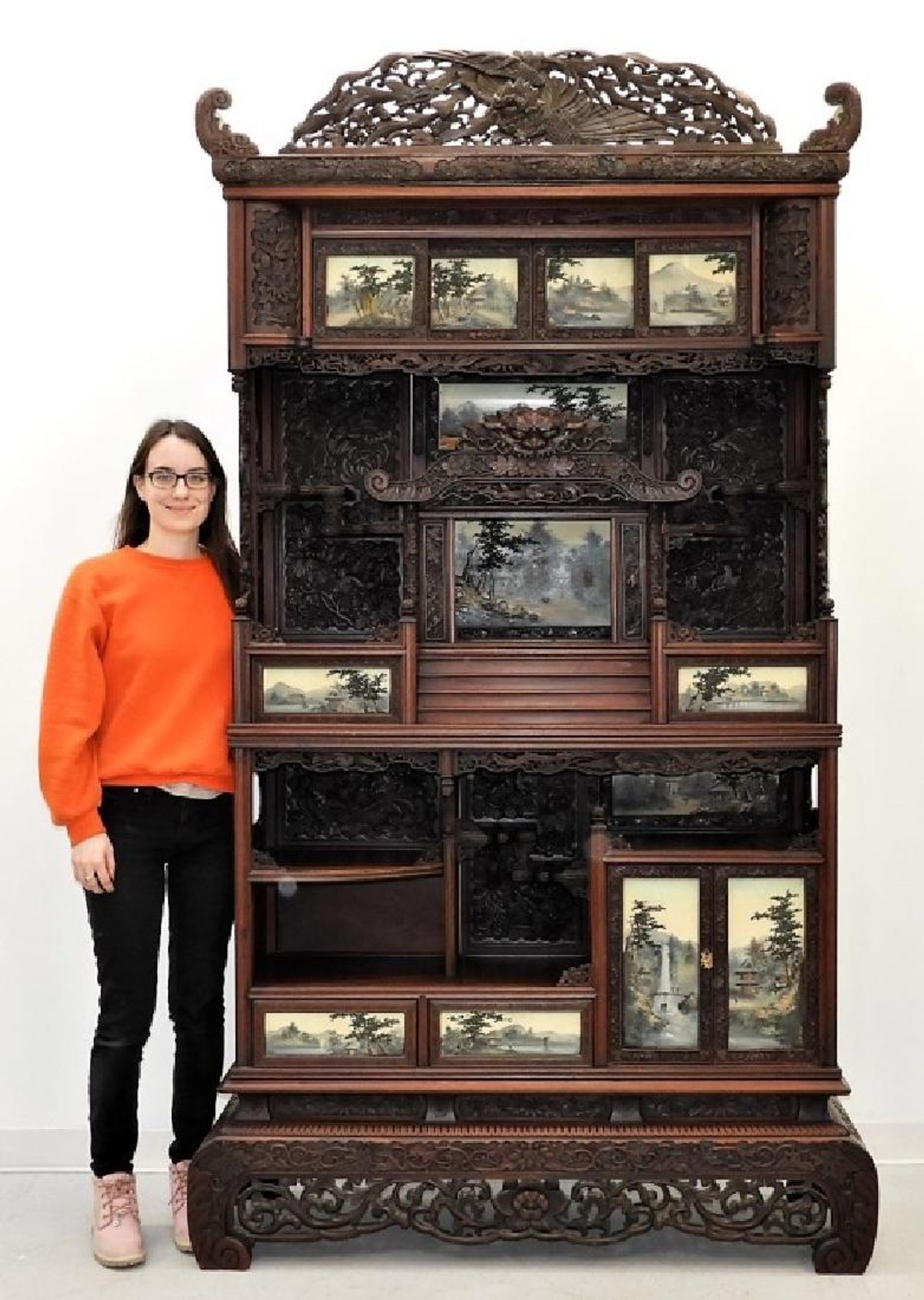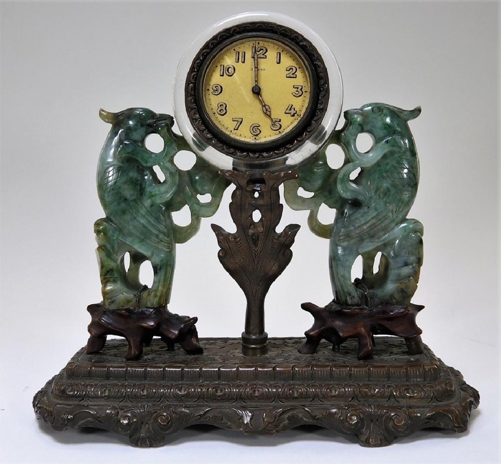 A large circa 1880 Japanese Meiji period carved wood etagere, 96 inches tall, found a new owner for $3,835. The etagere was profusely carved hardwood with multiple hand-decorated impasto painted panels of landscapes, with several shelves on a Kang form base. Also, a late 19th century jade rock crystal bronze shelf clock, made in China and Switzerland, with a rock crystal bangle embellished dial flanked by opposing birds clutching branches with two peaches, made $2,812.