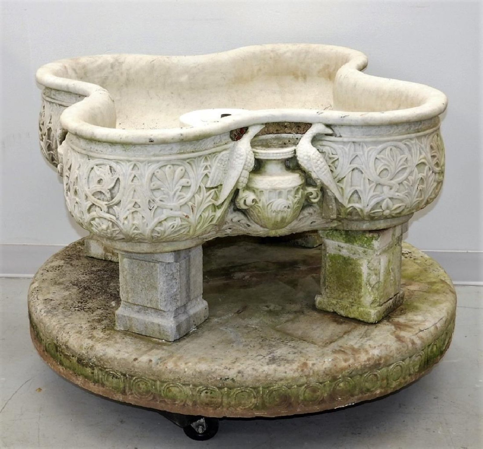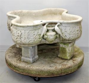 The other was a 19th century Italian Carrera marble fountain bowl base, which fetched $5,312. It was part of a delightful selection of exterior architectural antiques in the auction. The bowl, 38 inches in diameter and 22 inches tall, was quatrefoil form, with foliate ornamentation in relief, decorated with birds on either side. It was supported by four marble pedestals, all later added.