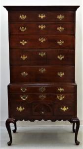 A Queen Anne stained tiger maple highboy, made in New England in the 18th century, 76 inches tall, having five graduated drawers over two vertical over three drawers with a fan-carved center, supported by stout cabriole legs with a shapely skirt, finished at $2,500; while a fine 18th century American Chippendale carved gilt and gesso mirror with Aesthetic chinoiserie design, having a full-figured phoenix bird crest adorning a shapely pierced foliate frame, 54 inches tall hit $4,688.