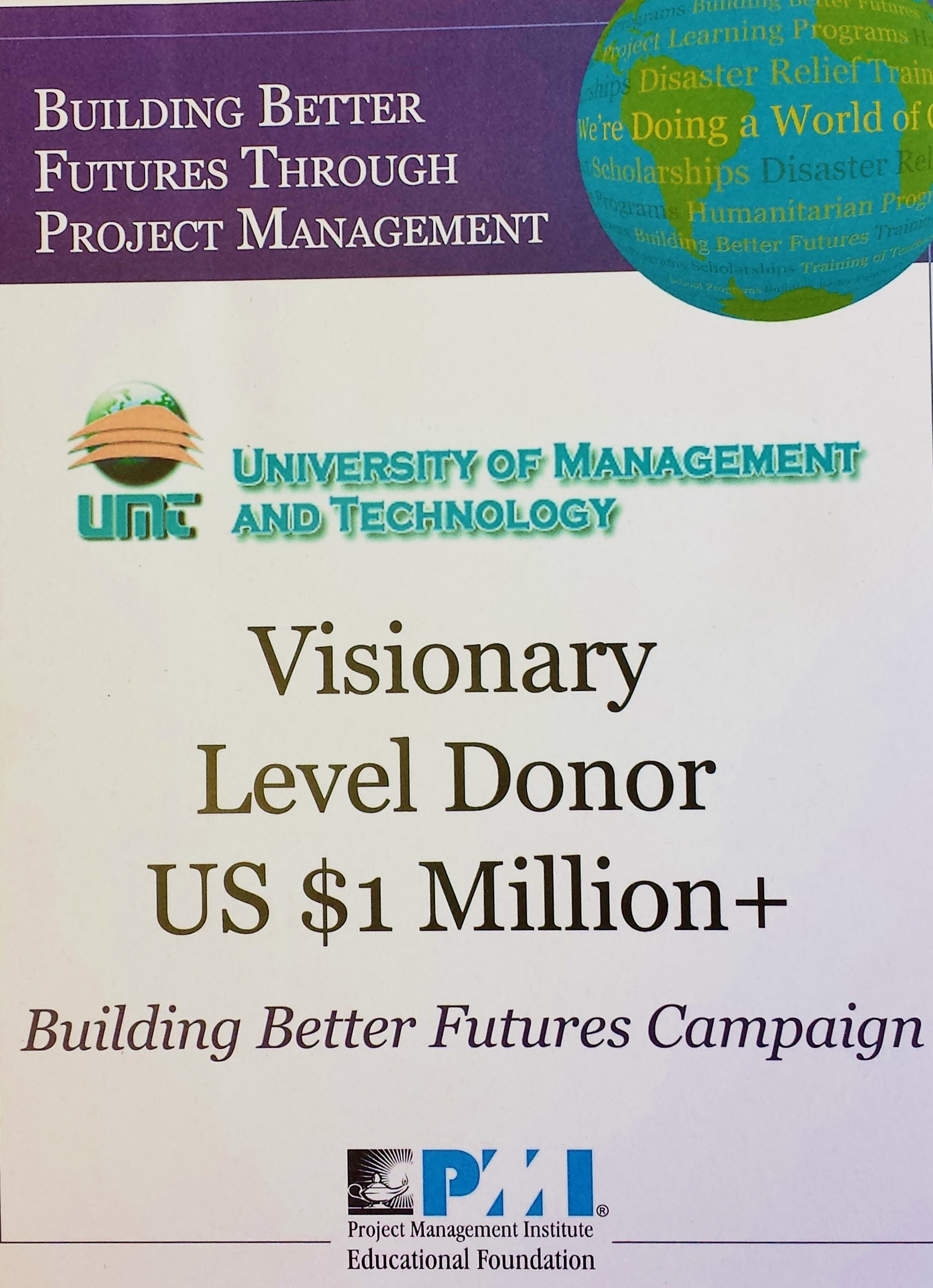 ROSSLYN, ARLINGTON, VA, May 10, 2018 /EINPresswire.com/ -- Committed to develop best and brightest future project management professionals worldwide through higher education, University of Management and Technology (UMT) has pledged millions dollars of academic scholarships over years in supporting Project Management Institute Educational Foundation (PMIEF), a not-for-profit organization, to build PM ready workforce, prepare PM knowledgeable youth, and empower PM capable NGOs.