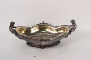 • An important French 19th century sterling silver oval centerpiece bowl, with rim stamped “Froment Meurice”, with the French hallmark Head of Minerva, plus a smaller illegible mark, having putti form handles on each side, a shell and scroll shaped border, engraved coat-of-arms on each side within a shaped cartouche, flanked on either side by graduated swirl motifs, ending with putti wrapped around the foot of a stylized serpent (total weight 133 troy ounces), together with shaped footed vermeil comforting insert (50 troy ounces).