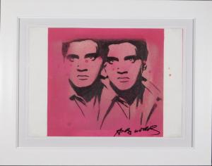 Two works have estimates of $30,000-$50,000. One is a mixed media on paper (graphite, ink, acrylic and silk screen) attributed to Andy Warhol (Am., 1928-1987), titled Double Elvis. It’s signed front and reverse and is verso marked with the stamp of Coopers International Auctions, with a reference number. It comes with a COA from Bonnier Art Services in Toulouse, France.