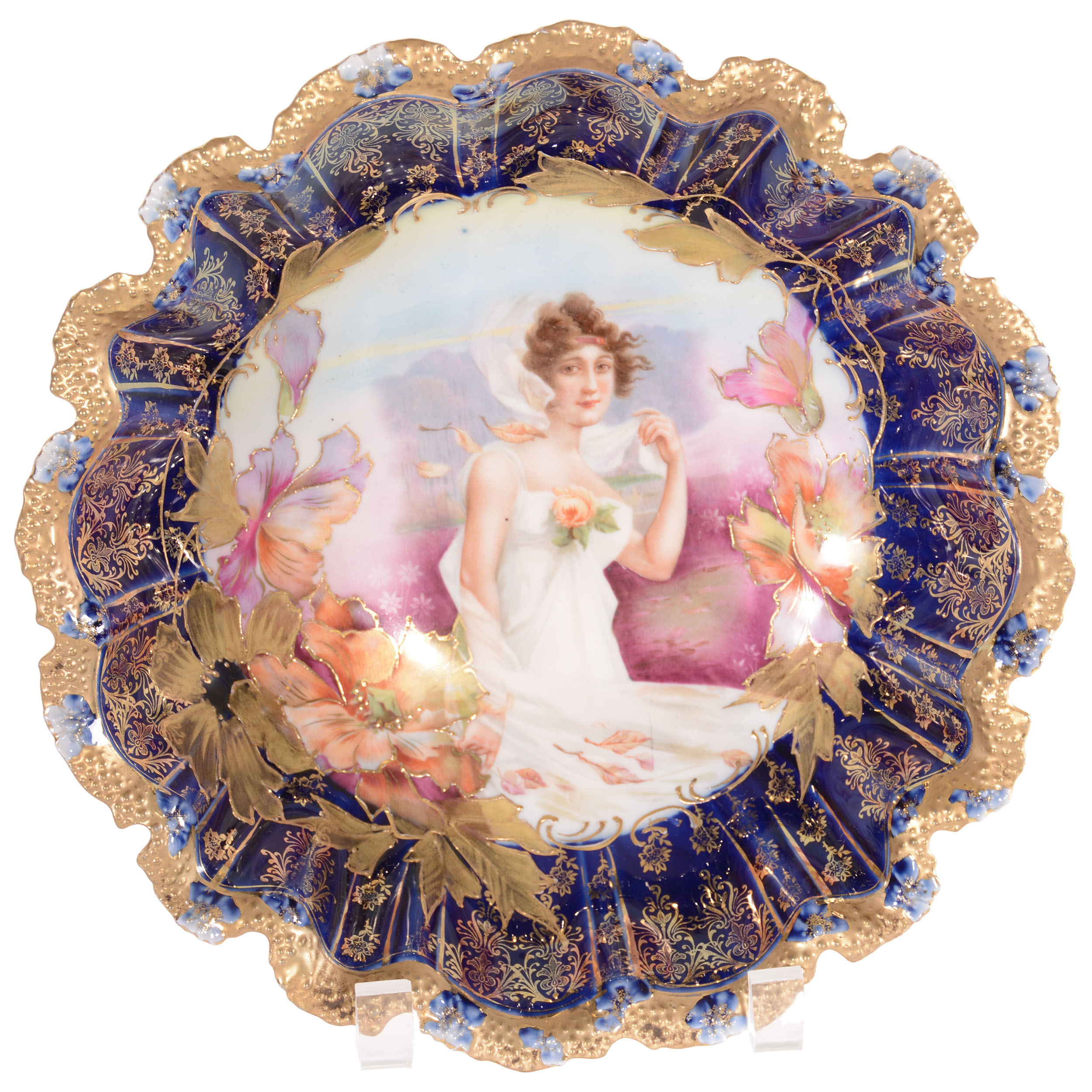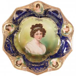 A magnificent marked RS Prussia stippled mold plate, 11 ¾ inches in diameter, having a fall season portrait décor with colorful poppy highlights and a wonderful cobalt blue and gold border with extensive gold stenciling, hit $6,000. Also, a marked Royal Vienna mold 5 ewer, 6 ¾ inches tall, with a figural tulip handle, cobalt blue with a Countess Litta portrait and gold stencil highlights, made $4,250.