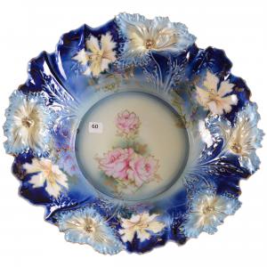 The other was a hard-to-find RS Prussia marked center bowl, 15 inches in diameter with a carnation mold, yellow and cobalt blue with a pink and yellow rose décor and gold stencil highlights. “This was possibly the finest 15-inch bowl we’ve ever had the privilege of auctioning,” Mr. Woody remarked.
