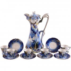 Two lots posted an identical selling price of $10,000. One was an unmarked chocolate set, cobalt blue with a stylized carnation décor and gold stencil highlights. The set featured an 11 ¾ inch tall chocolate pot, plus six rare demitasse size cups and six matching saucers.