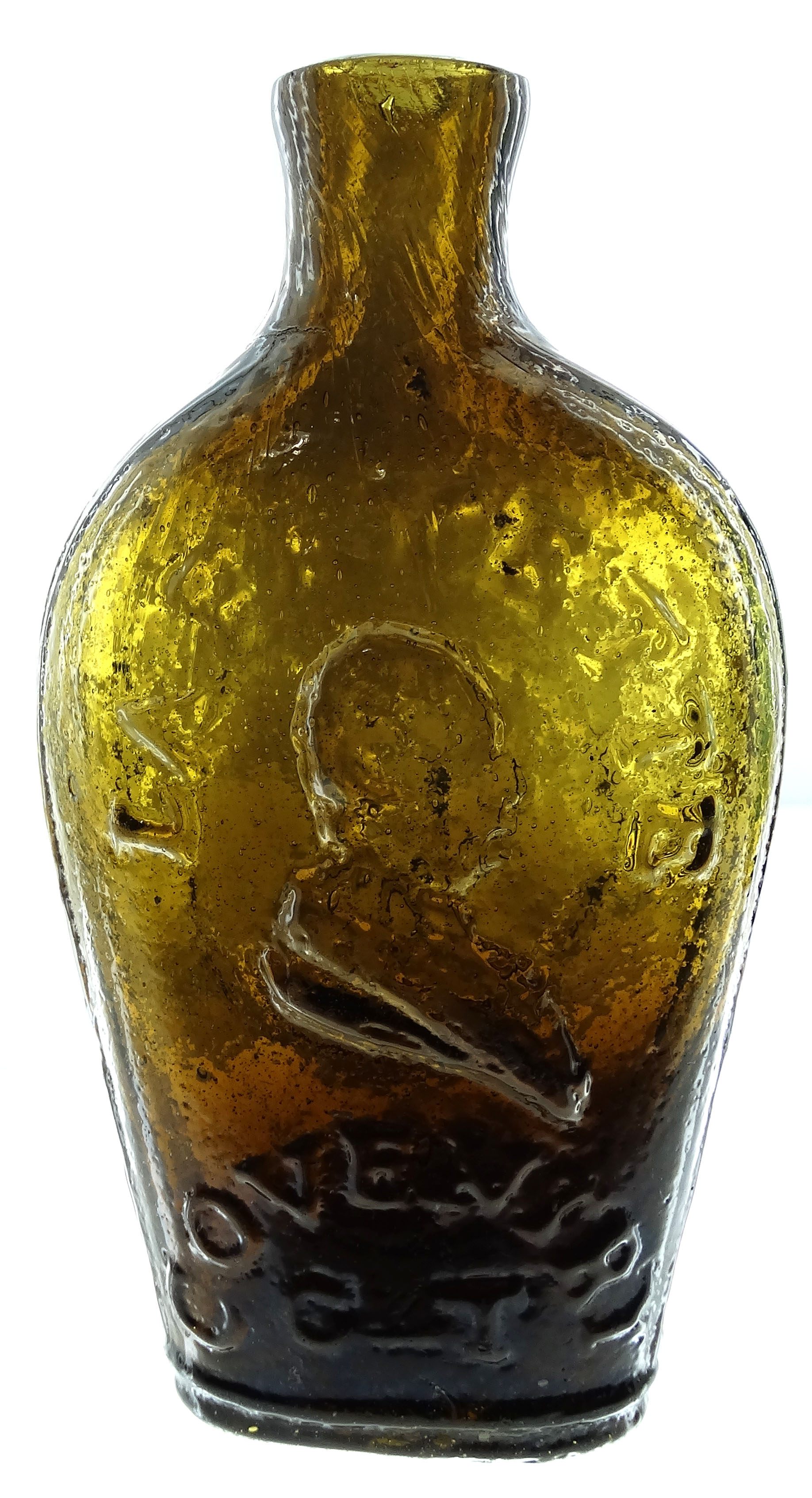 Other Western flasks will include some rare pumpkinseeds and amber flasks, plus an Arlington flask. Tops among the early American flasks is a beautiful Lafayette GI 86 bottle in the half-pint size, a nearly perfect piece of glass in a medium olive amber color. The flask, showing a bust of Lafayette (Coventry / C-T – Liberty Cap / S & S) grades 9, just for the wear, otherwise perfect.