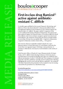 different mechanisms of action". Dr Boulos said "The emergence of resistance against the only three antibiotics currently used for treating CDI is alarming, highlighting the need for novel, safe and effective antibiotics". He continued "We believe Ramizol has the potential to be the standard of care for treating CDI and has the potential to be a blockbuster drug".
