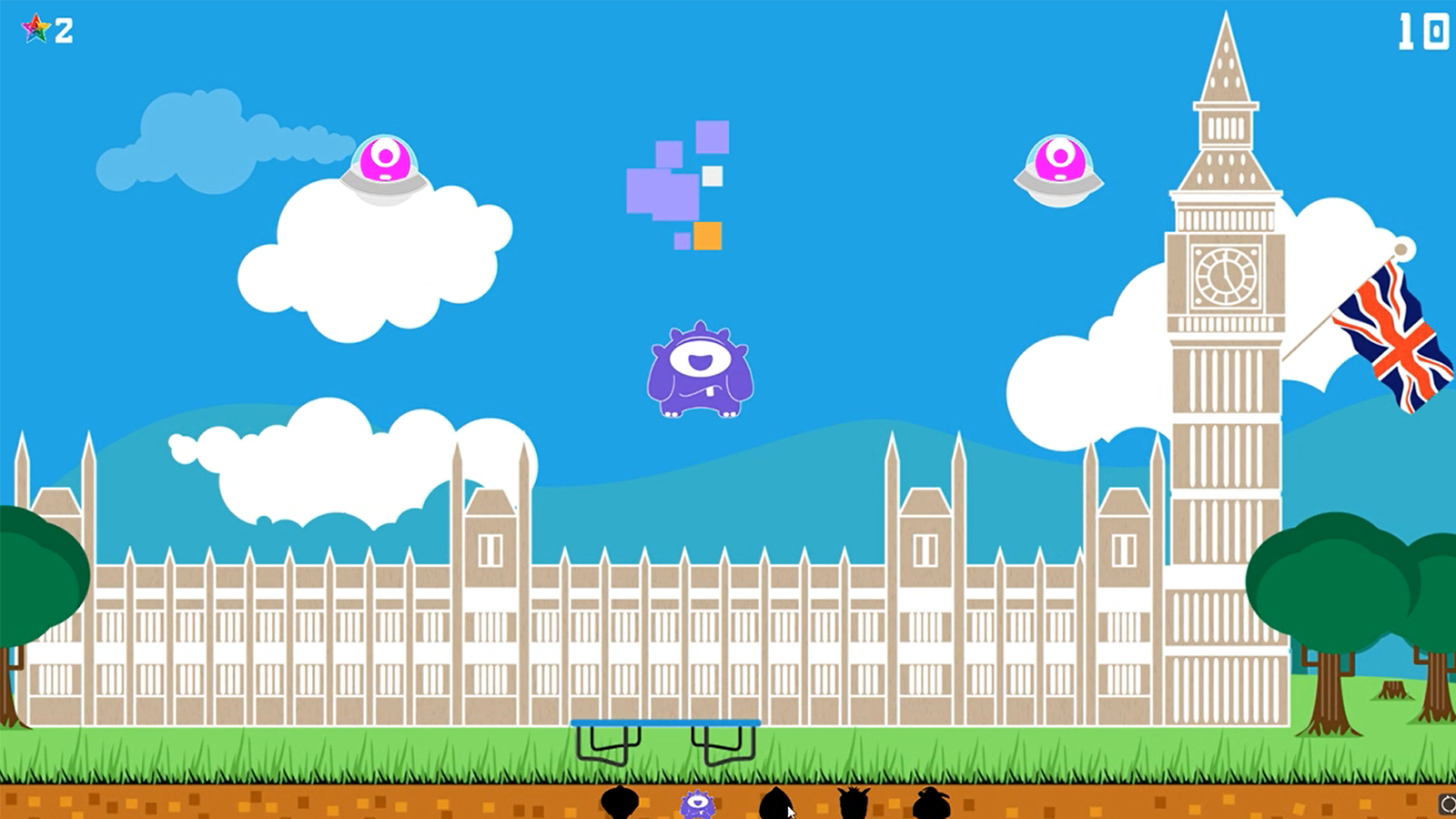 smashET is a 2D action-adventure that features hostile alien invasion on Earth. Players sends cute monsters up with a movable trampoline with aim to deliver as much damage to alien spaceships. The end goal is to save all of the 100 landmarks and destroy all spaceships.