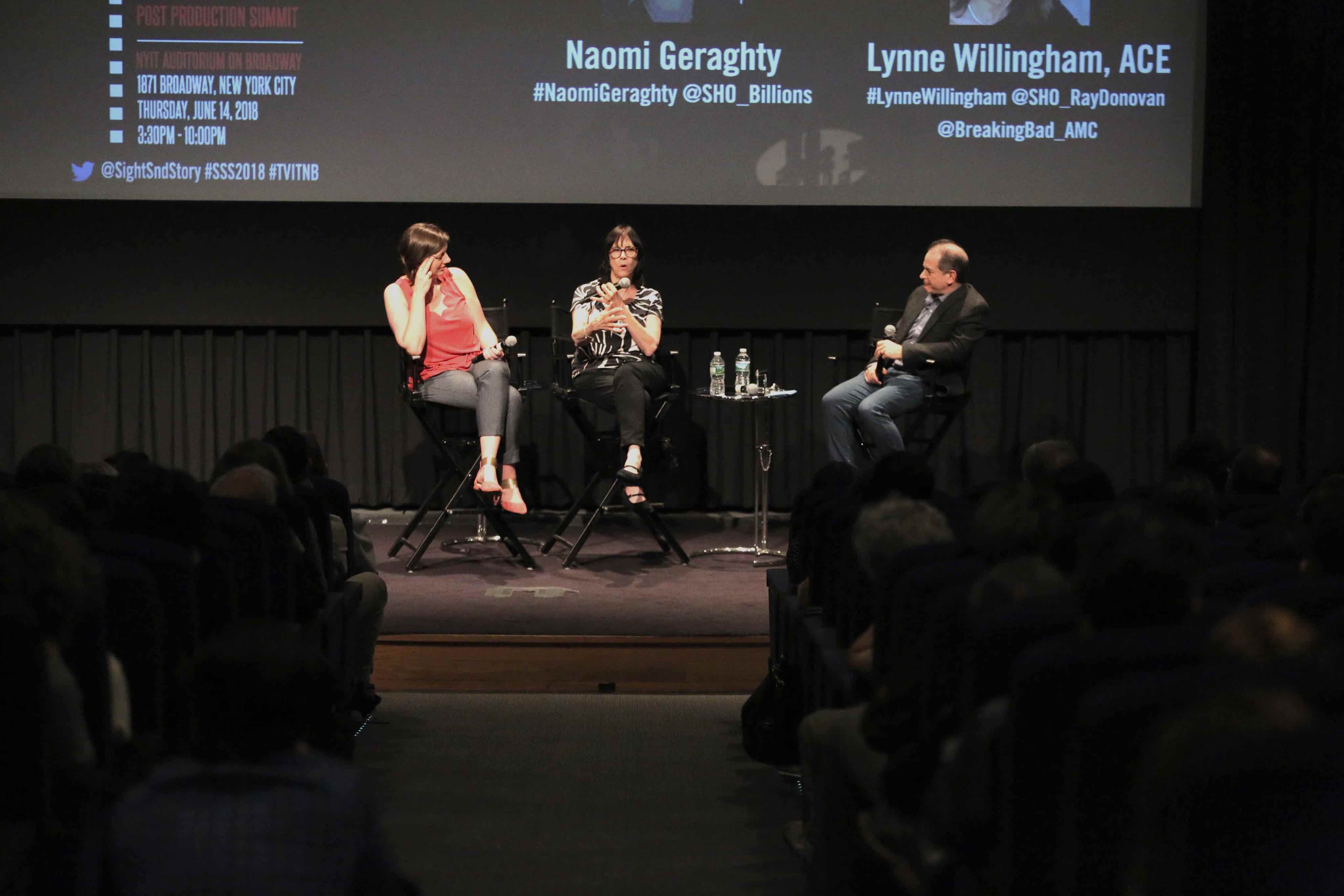 This year’s post-production summit started off with acclaimed documentary editors Bryan Chang (“Brasslands,” “Narco Cultura,” “A Year in Space”), Ann Collins (“Joan Didion: The Center Will Not Hold,” “Swim Team”), and Matthew Hamachek (“Cartel Land,” “The Trade,” “Amanda Knox,” “Meet the Patels”); moderated by Garret Savage. The second panel discussed the cinematic revolution of TV as experienced by editors. This panel featured Naomi Geraghty (“Billions,” “Bloodline,” “Treme”), Lynne Willingham, ACE (“Breaking Bad,” “Ray Donovan,” “X-Files”), and moderator Michael Berenbaum, ACE (“Sex & The City,” “The Americans,” “Divorce”).