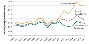 • Since 2015, both wholesale fuel prices and refining margins departed even further from underlying crude supply costs to the Vancouver market