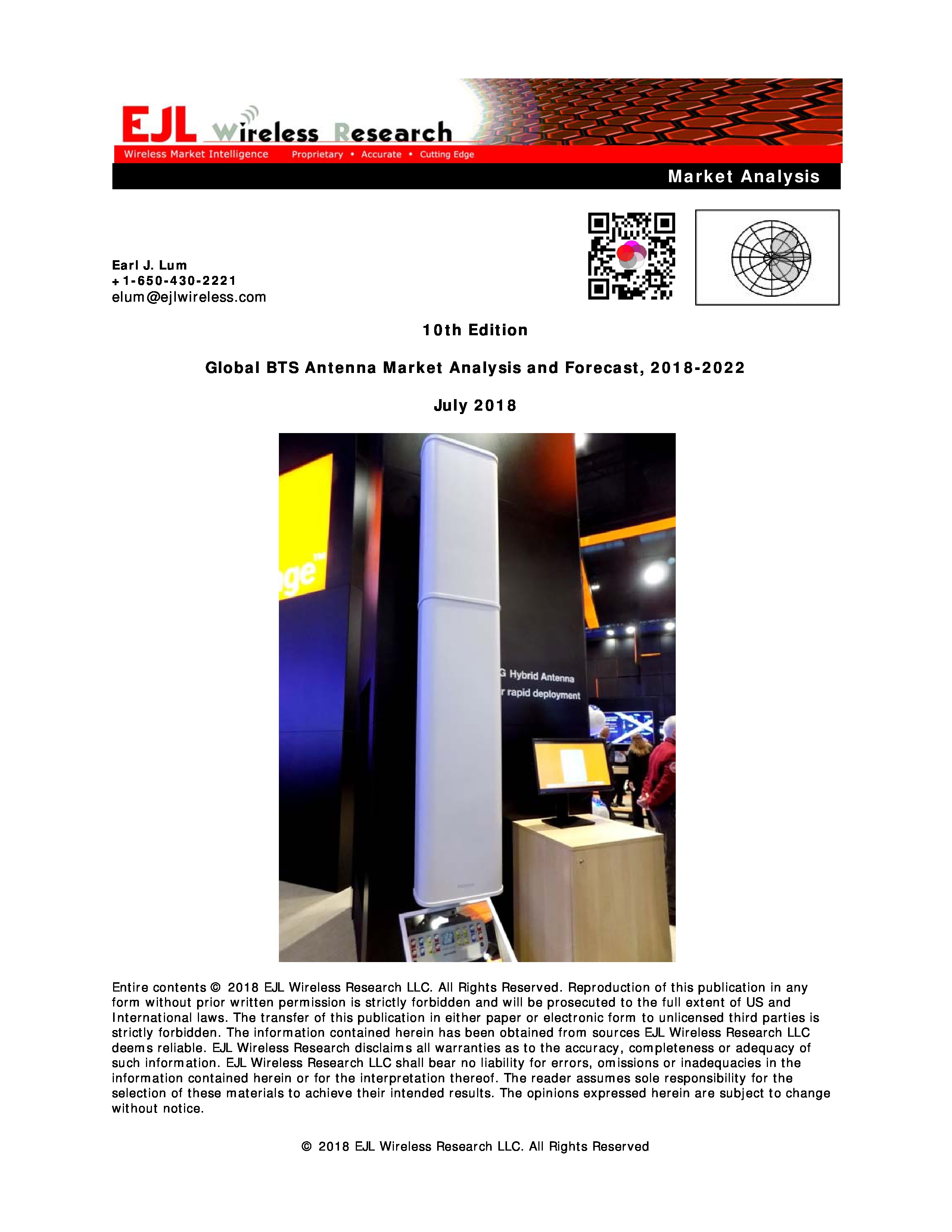 SAN FRANCISCO, CALIFORNIA, UNITED STATES, July 16, 2018 /EINPresswire.com/ -- Global macrocell BTS antenna shipments increased 7% in 2017 despite weakness in China and India, according to the latest report from EJL Wireless Research titled “Global Macrocell BTS Antenna Market Analysis and Forecast, 2018-2022 10th Edition.” “Initial shipments of FDD/TDD antennas, coupled with growth in FDD antennas, sAIA products, and MM-ARS products supported the growth. Antenna revenues surged due to the mix shift towards higher port count passive products as well as increased shipments of sAIA and MM-ARS solutions,” says founder and President, Earl Lum. EJL Wireless Research is forecasting that macrocell BTS antenna shipments will decline by 10% in 2018 due to the shift towards higher port count passive antennas and continued weakness in China and India, offsetting initial 5G MM-ARS shipments in South Korea and the United States. However commercial deployments of 5G MM-ARS solutions will drive revenues up 234% in 2018.