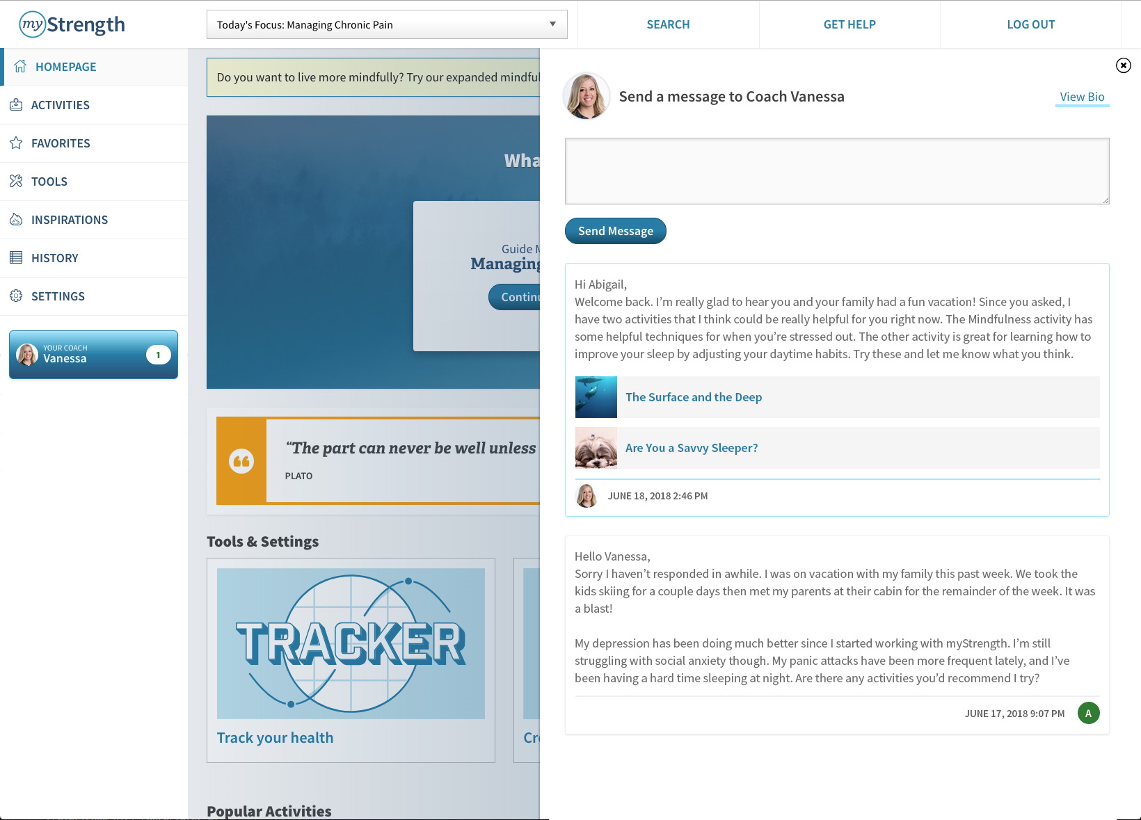 The new Coaching feature complements myStrength’s digital self-care resources by connecting members to a dedicated Coach who encourages positive behavior change and builds a human connection with hands-on encouragement, support and direction. Coaching further enhances and personalizes the myStrength experience by guiding members to the appropriate myStrength resources, augmenting the platform’s sophisticated machine learning algorithms that deliver an individualized, self-driven, HIPAA-compliant experience. Connection to a dedicated myStrength coach is made through digital interaction. Members receive personalized, stigma-free support through asynchronous messaging in myStrength’s web and mobile applications.