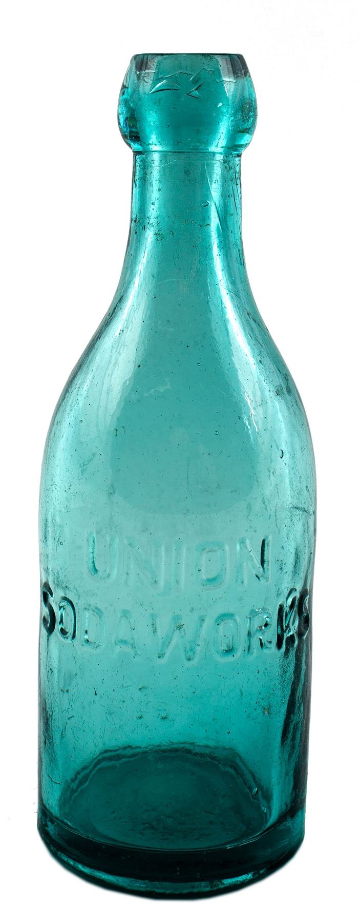 Union Soda Works (Tombstone, Ariz.) medium aqua bottle, clean and sparkling, with an applied top (est. $700-$1,500).