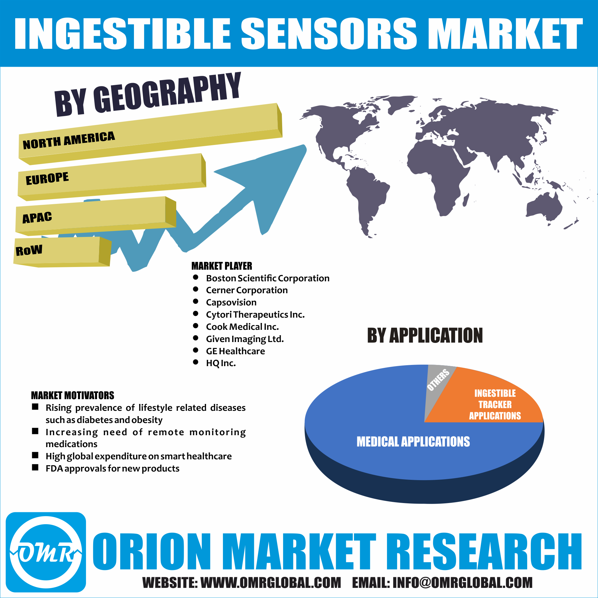 INDORE, INDIA, August 27, 2018 /EINPresswire.com/ -- According to the OMR analysis, the global ingestible sensor market is expected to grow at a significant rate during forecast period 2018-2023. The rising prevalence and incidence of lifestyle related diseases such as obesity and diabetes are driving the growth of the global ingestible sensor market. The global ingestible sensor market is segmented on the basis types of sensors, application and geography. The report provides detailed and insightful chapters on market overview, key findings, strategic recommendations, market estimations, market determinants, key company analysis, company profiling, market segmentation, geographical analysis and analyst insights.