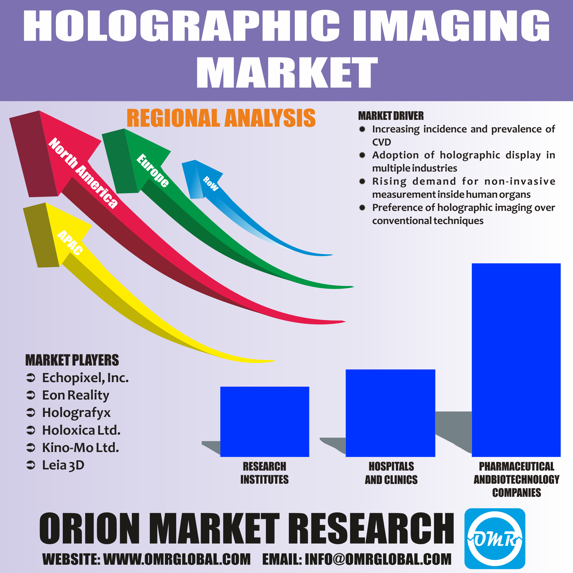 INDORE, INDIA, August 27, 2018 /EINPresswire.com/ -- According to OMR analysis, the global holographic imaging market is expected to grow at a significant rate during the forecast period (2018-2023). The global holographic imaging market has witnessed a significant growth due to increasing prevalence of CVDs. The global holographic imaging market is segmented on the basis product type, application, end users, and geography. The report provides detailed and insightful chapters on market overview, key findings, strategic recommendations, market estimations, market determinants, key company analysis, market insights, company profiling, market segmentation, geographical analysis and analyst insights.