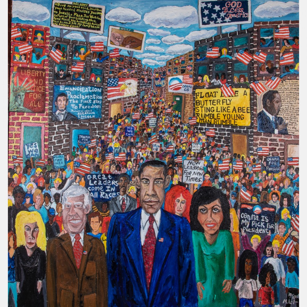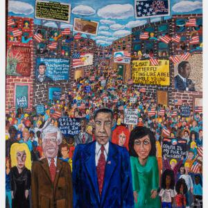 Stand and Be Counted is a large acrylic on canvas depicting in intricate detail a crowd of hundreds led by then-candidate Barack Obama. It’s a delightful yet sobering reminder in our current political era, of the optimism and excitement that accompanied the election of the first African-American president.