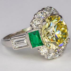 Stunning platinum, diamond and emerald ring set with a round, brilliant cut, fancy yellow 5.18-carat diamond (est. $35,000-$45,000).