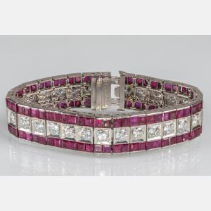 Lot 211 is a 14 kt. yellow gold, platinum, and diamond ring set with one brilliant round cut diamond weighing approx. 1.36cts, with a SI-2 clarity and D-E color, and also set with ten princess cut natural diamond melee, total approx. weight 0.65ct, all SI clarity and near colorless; Lot 202: a 14kt. white gold and diamond drop pendant necklace; and Lot 204: a 14kt. white gold, diamond and ruby bracelet.