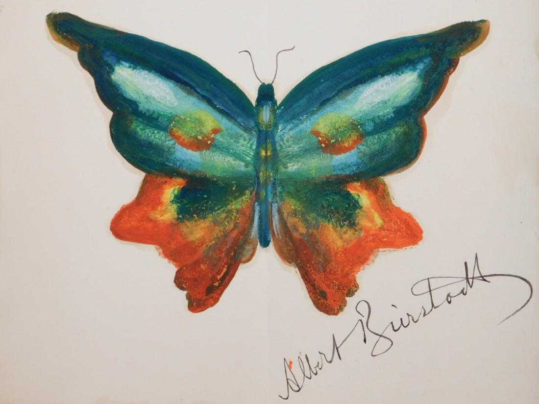 The oil on paper board attributed to Benton, titled Portrait of a Boy, is signed bottom right and unframed. There’s an unidentified marking verso. Benton was one of America’s preeminent pre-war regionalist painters. The oil on paper attributed to Bierstadt is titled Butterfly. It’s 8 inches by 9 ½ inches unframed. Bierstadt, perhaps the best 19th century American landscape painter, was also known for making butterfly paintings as souvenirs for the female guests at his soirees.